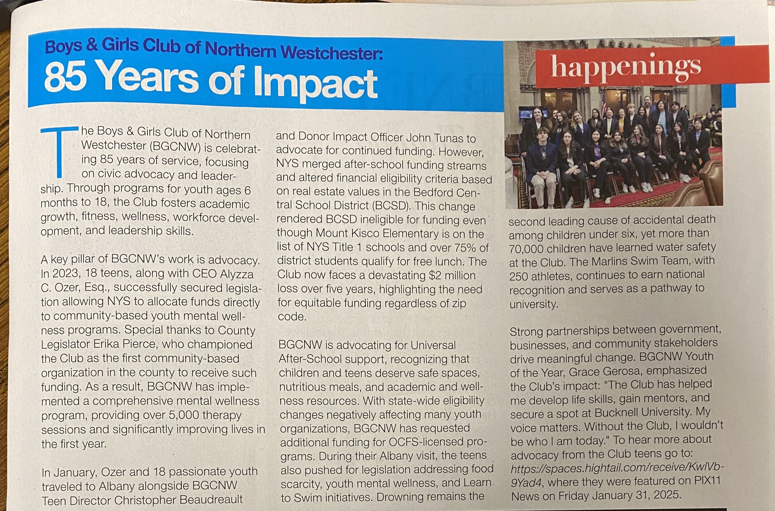 The Boys & Girls Club of Northern Westchester is celebrating 85 years of service, focusing on civic advocacy and leadership. Through programs for youth ages 6 months to 18, the Club fosters academic growth, fitness, wellness, workforce development, and leadership skills.