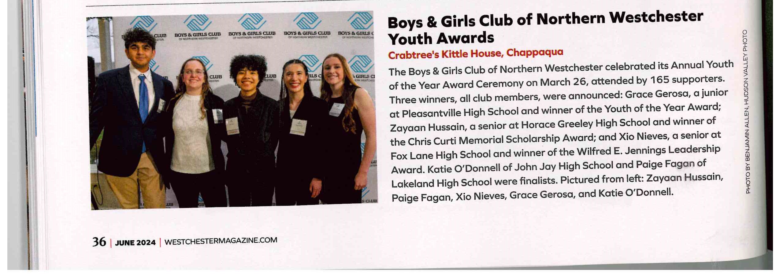 The students were announced as winners during the Boys & Girls Club of Northern Westchester’s Annual Youth of the Year Award Ceremony on Tuesday, March 26 at Crabtree’s Kittle House in Chappaqua, the organization announced on Friday, March 29.